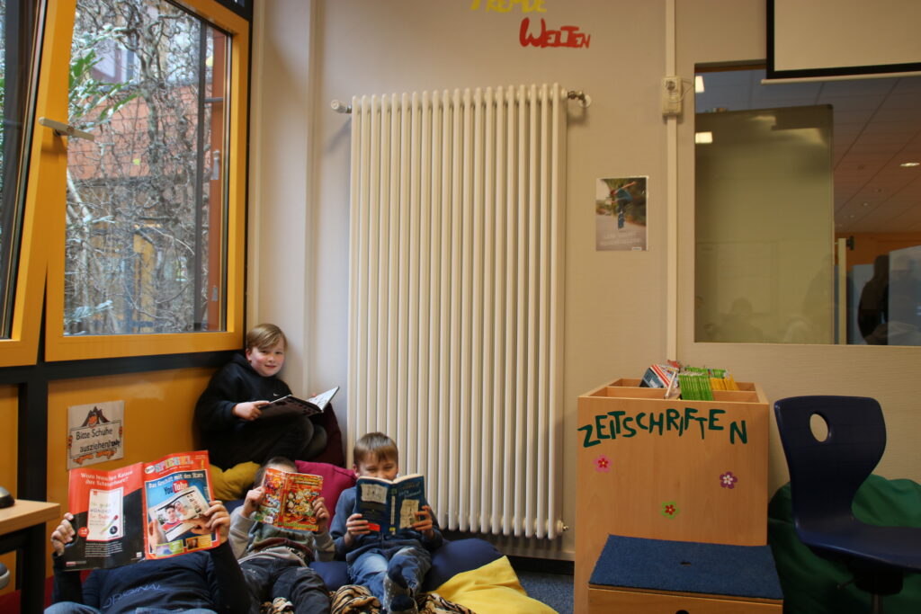Kinder wollen lesen und wir wollen auch, dass Kinder lesen. Zum einen ist das Lesen die Kulturtechnik schlechthin und damit von zentraler Bedeutung für das Lernen, Leben und Arbeiten eines Menschen. Zum anderen steckt im Lesen eine eigene Welt, die sich nach Möglichkeit jedem offenbaren sollte. Deshalb haben wir, Lehrkräfte, Eltern und Kinder, eine Bibliothek gegründet, in der Bücher gelesen oder geliehen werden können. Selbstverständlich wird die Bibliothek von Schüler*innen organisiert und verwaltet. Während der Bibliothekszeiten können sich die Schüler*innen außerdem im Schachclub oder in der Spieleecke beschäftigen. Tee und Gebäck werden vom Team „Teestube“ vorbereitet.