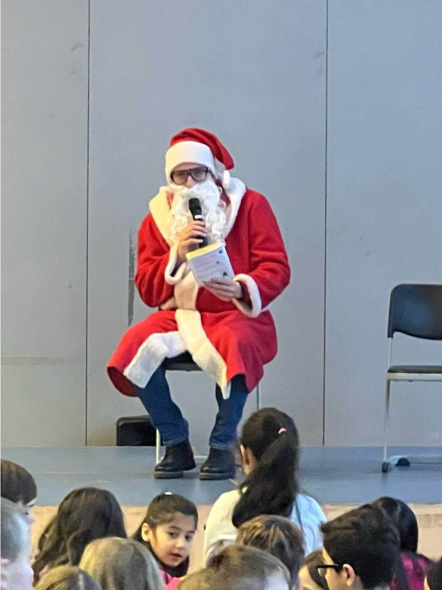 Nachdem er am 6.12. auch schon viele Familien besucht hatte, legte er am 8.12. noch einmal einen Zwischen-Stopp an unserer Schule ein, kurz bevor er sich wieder auf seinen Rückflug von der Erde machen musste. Die Kinder konnten ihm Fragen stellen und er hatte für jede Klasse einen Beutel mit kleinen Geschenken dabei.