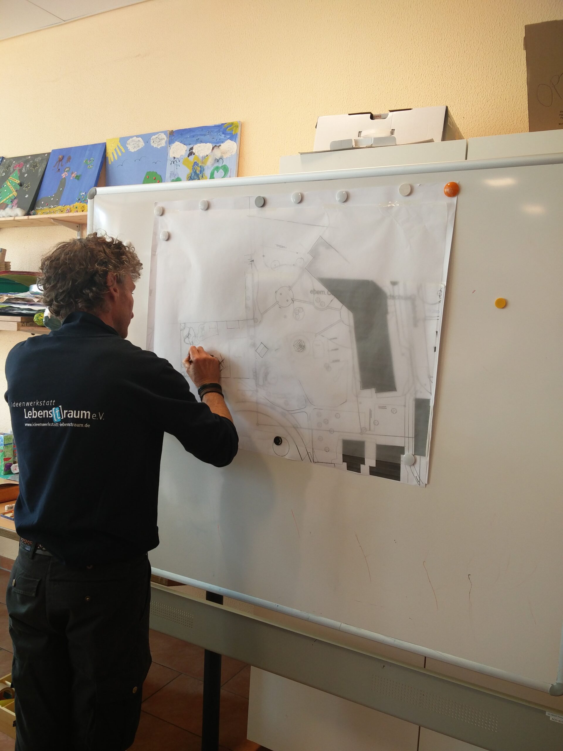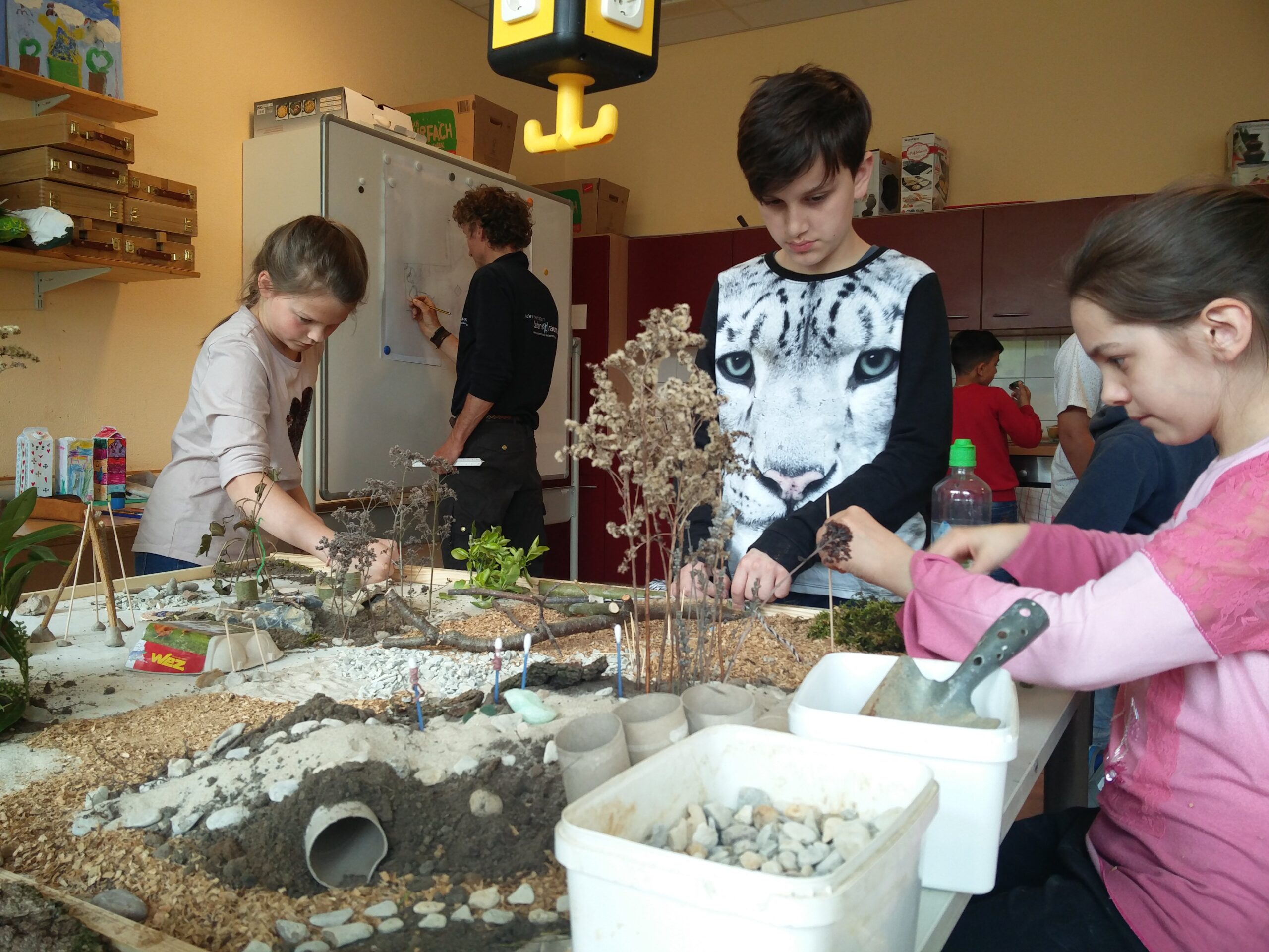 Nach einer Begehung des Schulgeländes mit allen beteiligten Interessengruppen Anfang April finden nun zwei Planungswerkstätten statt, in denen Schülerinnen und Schüler der Jahrgänge 1-6 und 7-10 ihre Wünsche und Ideen in Modellen mit den unterschiedlichsten Materialien (Erde, Ton, Äste, Blätter Gras, Klopapierrollen, Strohhalme, Konfetti, Steine…) bauen und festhalten. Anhand dieser Ideen zeichnet Dipl. Ing. Stefan Wrobel von der Ideenwerkstatt Lebens(t)raum parallel eine Planungsskizze des neuen Schulhofes.