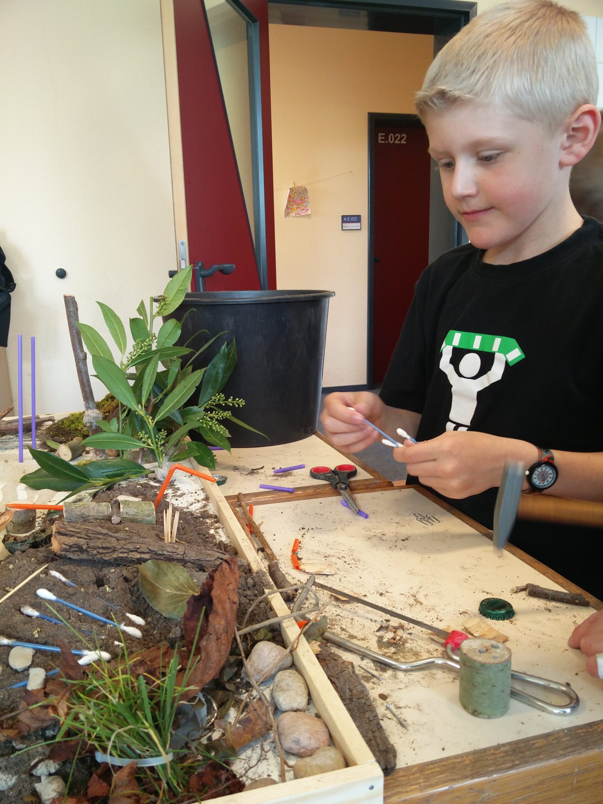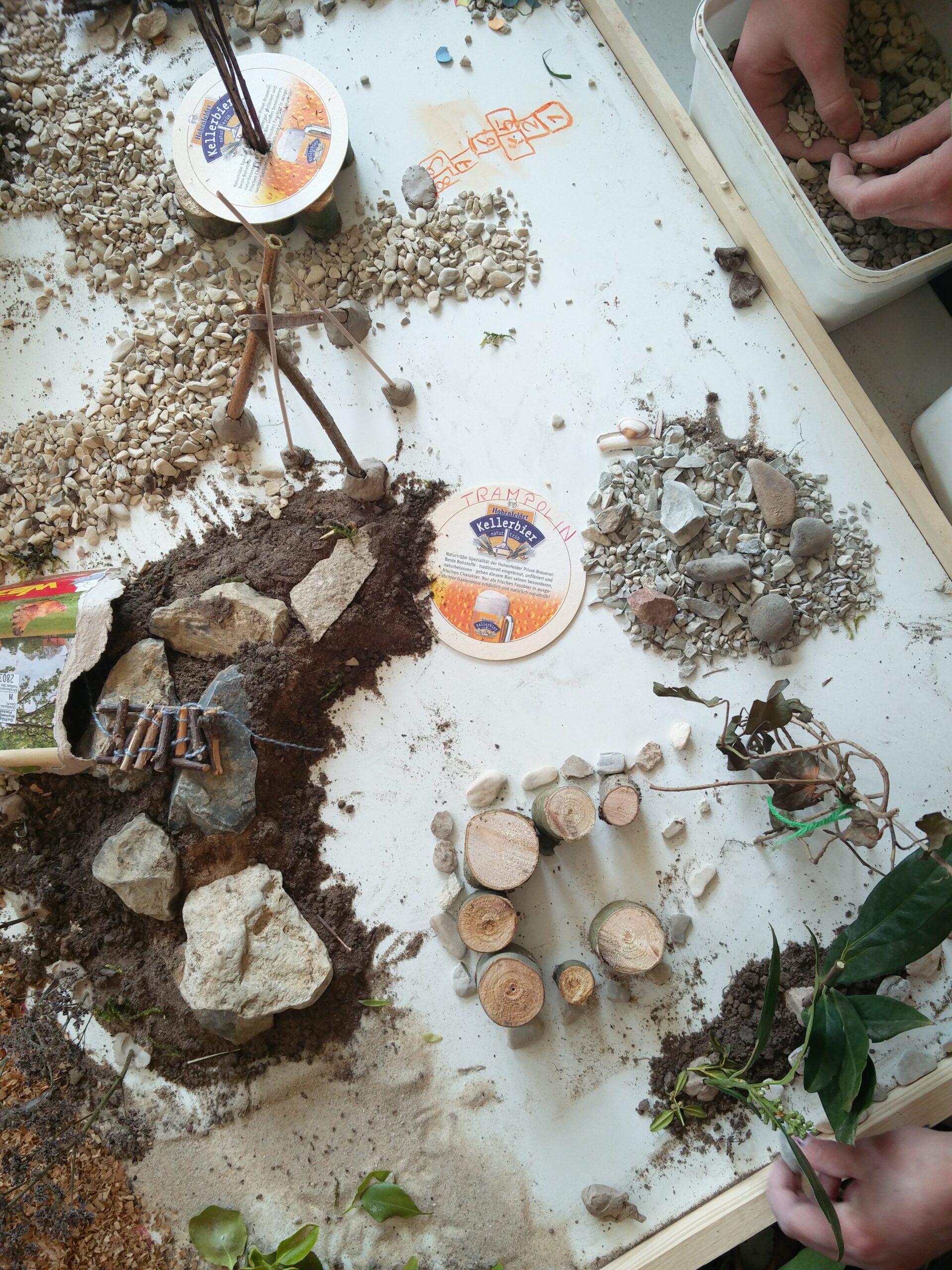 Projektwoche zur Schulhofgestaltung: Es werden Sitzmöbel aufgestellt, Hüpfspiele auf den Schulhof gemalt, zwei Weidentipis entstehen und einiges mehr…