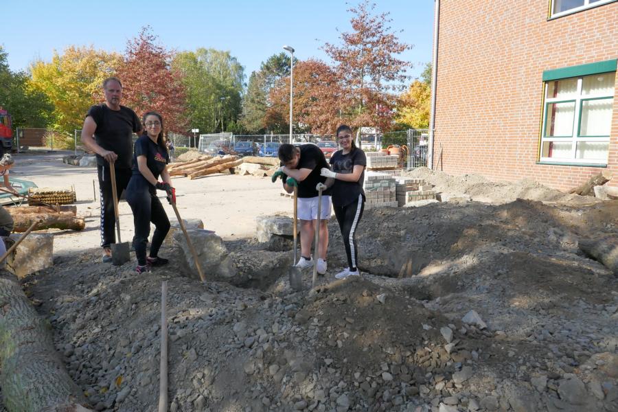 1. Baueinsatz vor der Sporthalle mit Eltern, Schüler*innen und Lehrkräften